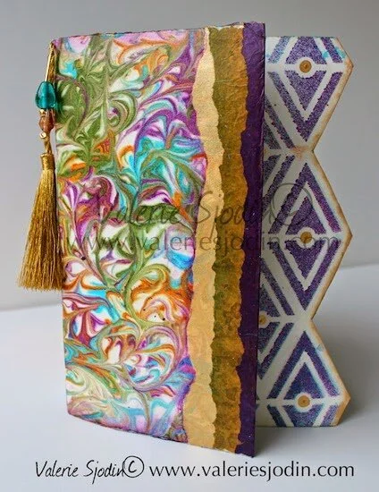 This journal was started as a demo in my 2-day Art Journaling Workshop. The studio and covered area overlook the labyrinth seen above. Below shows the front of the journal where I demonstrated marbling, painting papers, and working with stencils.