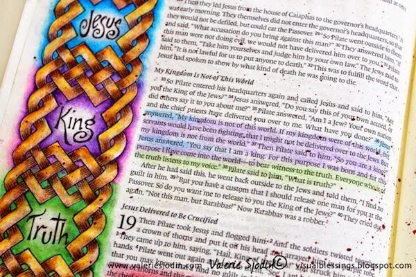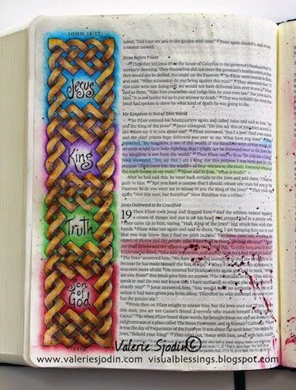 At first, I found myself relating to Pilate in the story. I felt compassion for Pilate's "no-win" situation, the pressure of the political climate he was in with Rome and the religious leaders, how he questioned, "What is truth?" and how he was torn to have a man crucified that he found guiltless. Also, I imagine the distress in his soul as he stood face to face, eye to eye with Jesus.My thoughts then went back to the previous chapter where Peter denies Jesus, and the disciples were scattering. Fear, disappointment, questioning. Clearly, this is not how they saw things playing out in their life or the life of their Messiah. I consider their presuppositions about Jesus. I wonder about my own. I have had presuppositions about what God is doing, and have been disappointed and confused. I have been comfortable with the knowing Jesus is King, the Truth, Son of God, but not really embracing the suffering, and death. In reading the crucifixion story, I must remind myself that for the disciples, and for Jesus, it is pre-resurrection and ascension. It is a point of desolation.It coincides with my own desolation. One of doubting if I heard God correctly in a situation, one of doubting God, of dealing with loss. Times like that I am tempted to numb the pain by watching an extraordinary amount of British television while drinking red wine and eating dark chocolate, doodling like crazy, and hope I eventually learn to accept the unacceptable. This time is different. I am intentionally pressing in to God, facing the pain, making time to enter His quiet presence, a place of not knowing, risking finding nothingness. It is during that time, I decide to paint in my Bible. Up until now, I have hesitated to paint in it or cover any words. Now it was an act of courage, faith in the process of not knowing the outcome, and trusting God that I couldn't mess it up. Instinctively I sensed it was part of my healing process.After I had done the Celtic knot and lettering in the middle, I brushed a thin coat of matte medium on both pages and let them thoroughly dry. Then I cut two strips of brown painted paper and glued them on with matte medium. I wrote the words in the margin in pencil and then went over them with Pitt a black pen. Then I spattered Quinacridone Crimson fluid acrylic paint on the page, and spritzed it in a few spots with a mister filled with water.