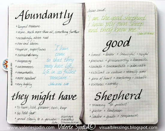 As I did the word studies for John 10:10 in my everyday journal (two pages are shown below) the meaning starts to sink in: To belong, to be known, to be loved. That is what we all want. That is what Jesus came for. He makes the amazing statement that he knows me like the Father knows him, and I can grow to know him like that too! How far does that knowing and loving go? To the point of death on the cross where Jesus, willing, laid down his life for the sake of his people, his sheep, for me. I am so grateful.