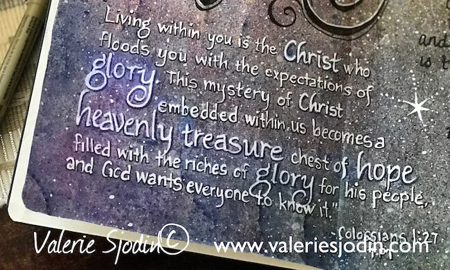 To be honest, I felt a little bit afraid of the dark color. It is totally different than any other color of the year I’ve had. I asked if there were other colors for the year. The first thing to come to mind was not colors but contrast, light against the dark. It was like God dropped the year’s theme through the revelation of color, flooding my imagination: Deep blue to nearly black representing darkness with the presence of the Spirit; light shining in the darkness. The cosmos. Stars and planets illuminating the night sky have always fascinated me. White light that holds all color, the warm colors and the shape of a flame came to mind.In 2005 I was painting Cosmic paintings and still do sometimes. I love it! The painting over the mantle in the first photo shows my first one. This type of painting represents an overcoming, life-changing season of my life. I began to play around with painting papers with the theme of the night sky, much like I did with the paintings, only with a lot less risk.