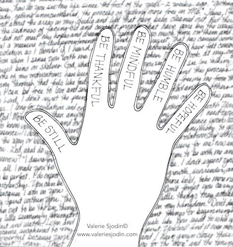 Trace around your hand and write th 5 BEs on the fingers as a reminder of the following prayer process. Record the experience in a journal or on the background of the page with the traced hand. You can add doodles and messages if desired.