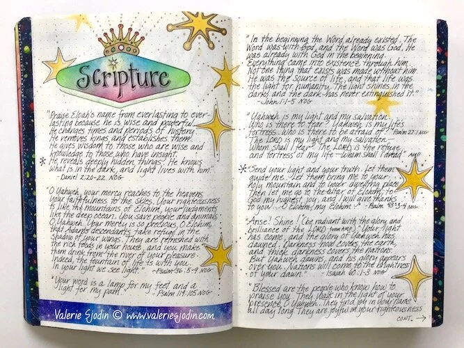 After printing out the pages, I read through the chosen verses again, marking the ones that resonate the most. I decided to limit the verses in my Word of the Year - Everyday Journal to fit on four pages, hand written. I put headings on the page using the Mid-Century Modern Banner and Doll Crowns Stencils (shown at end of post,) Pens, and Gelatos.