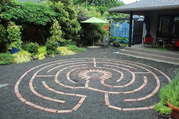 About 15 years ago when we were slowly working on our backyard, I came home from teaching, turned on the music and built a labyrinth out of bricks in our graveled courtyard. It took me awhile, but I was determined to finish and not feel rushed to get it done. That was a challenge for me, but it got done, and I enjoyed doing it. People have enjoyed it for all these years, walking it, running it (our grandsons), and a place to gather around the fire.
