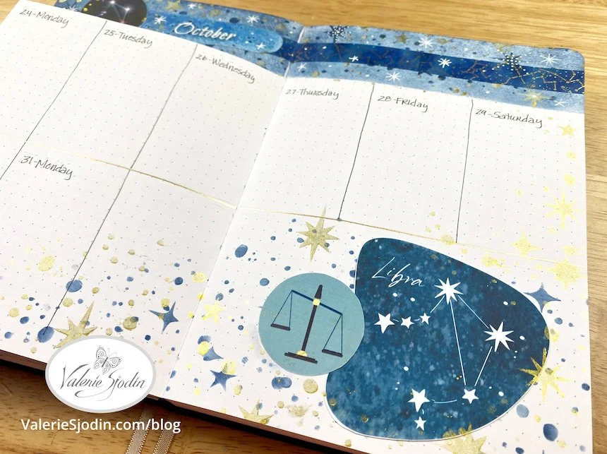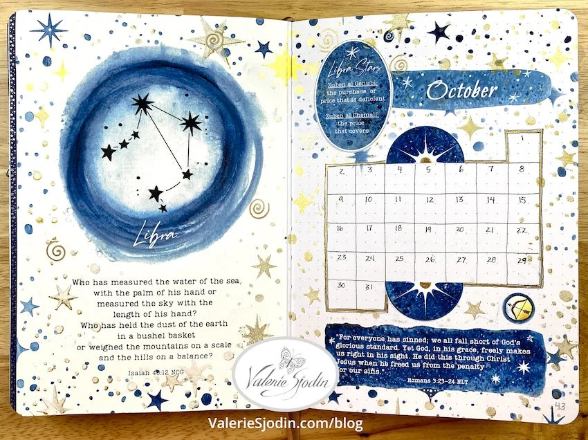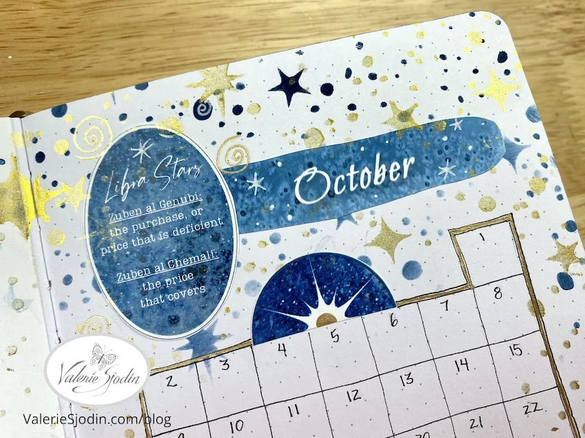 Below is a quick flip-through video of October’s journal featuring the Libra constellation. If it is not clear, you can adjust the resolution by clicking on the gear icon at the bottom right, second from the end. I’ve used the free digital download and the Libra and Virgo downloads, along with some of the moon featured in my shop: https://www.valeriesjodin.com/shop